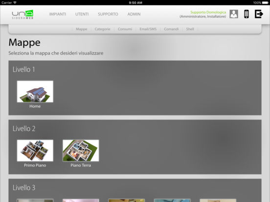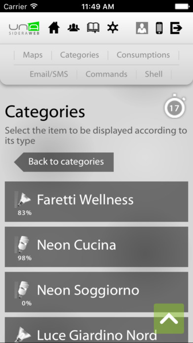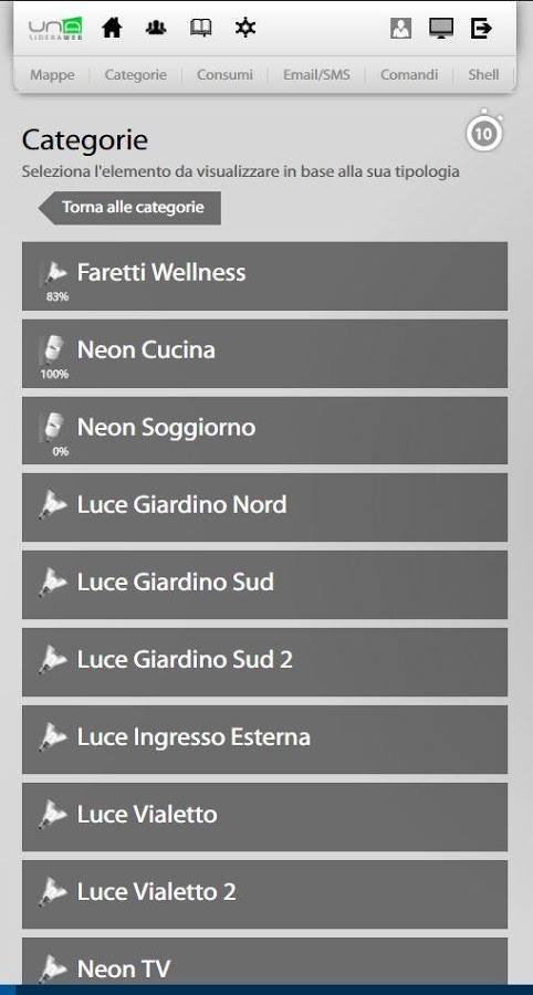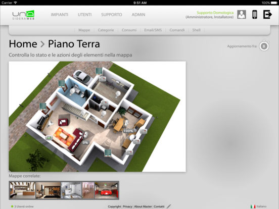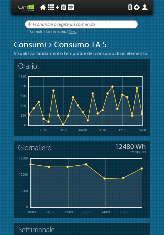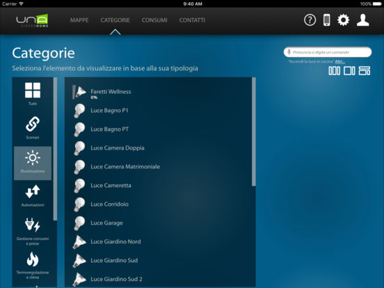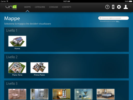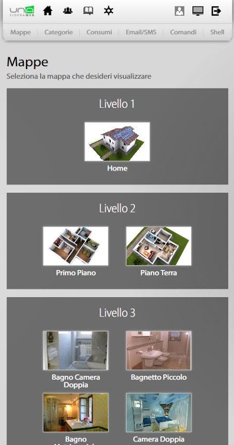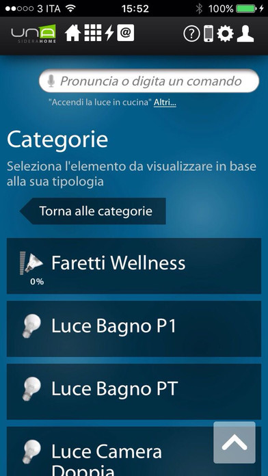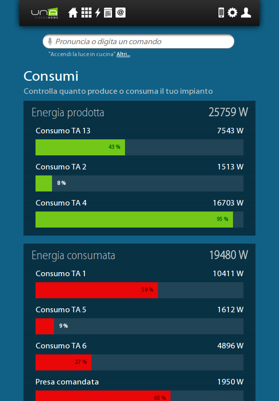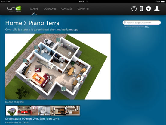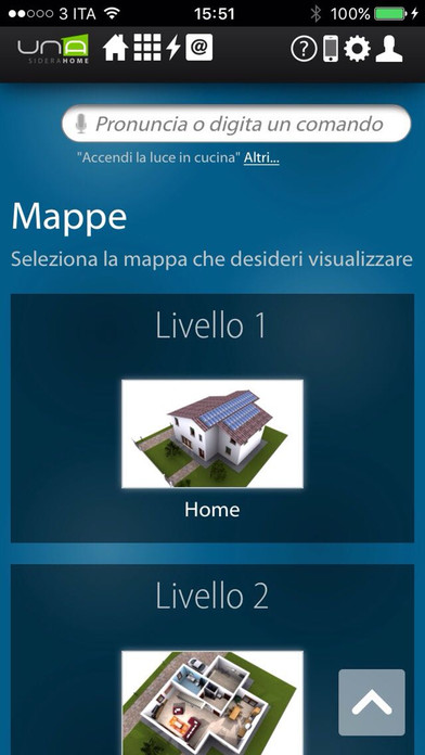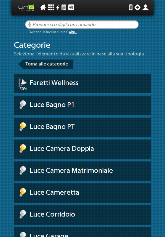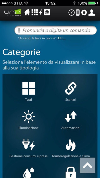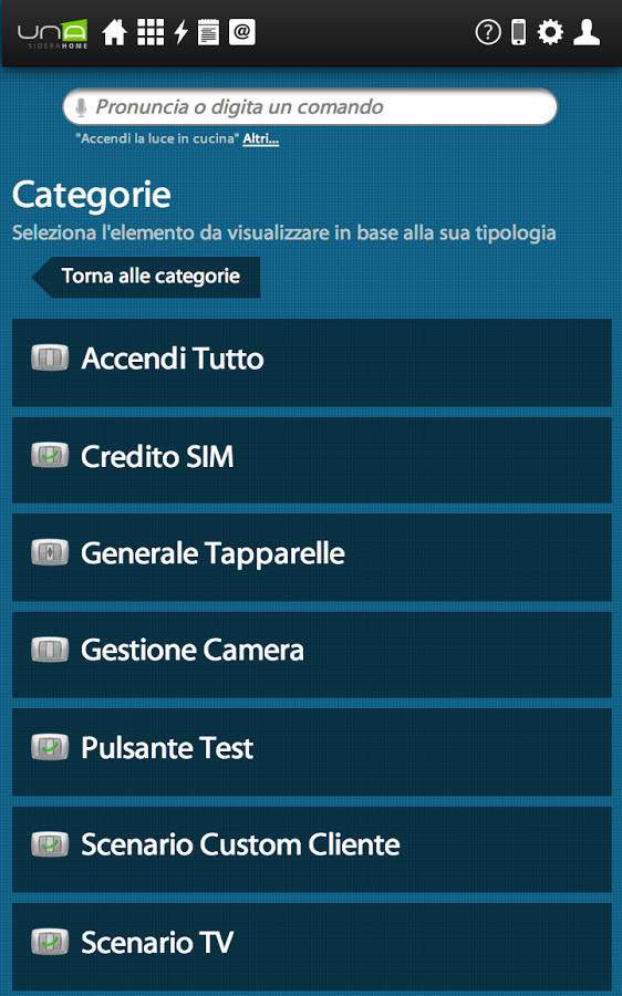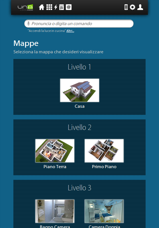 A través de su teléfono inteligente o tableta, se puede conectar fácil y rápidamente a su casa y comprobar cada dispositivo conectado al sistema domologico UNA. UNAMobile es capaz de detectar la presencia del implante UNA en la misma red Wi-Fi y para configurarse, o para acceder al sistema UNA desde cualquier lugar a través de una conexión a Internet y el servicio de autenticación SideraWeb.